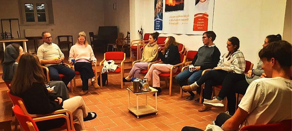 V ponedeljek, 10. novembra 2025, smo ob toplem in sladkem čaju v našem domu gostile dva topla človeka – Tino in Gašperja Berčiča. Brez »pocukranega« olepšavanja sta pred nami razgrnila zgodbo njunega zakona. Mož in žena s petimi otroki, katerih vsakdan je vedno poln domačih in službenih obveznosti, sta pred časom v sebi začutila poslanstvo, da to zgodbo podelita še z drugimi. Tako sta predvsem nam, mladim, s svojim zgledom pokazala, kaj vse pomeni odločiti se in prizadevati si za skupno zakonsko življenje.